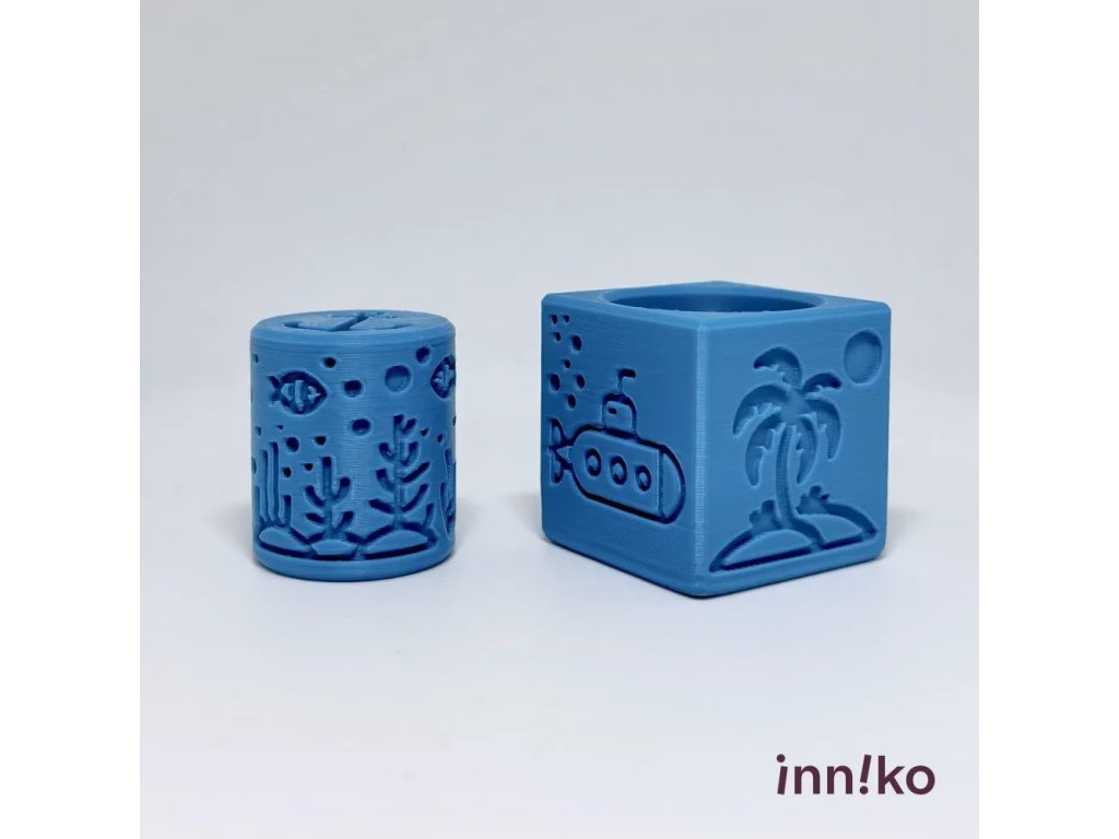 Kostka má rozměry 36×36 mm, váleček výška 33 mm, průměr 29 mm. Drobná optická nepravidla z 3D tisku jsou přirozená a nemají vliv na funkci.